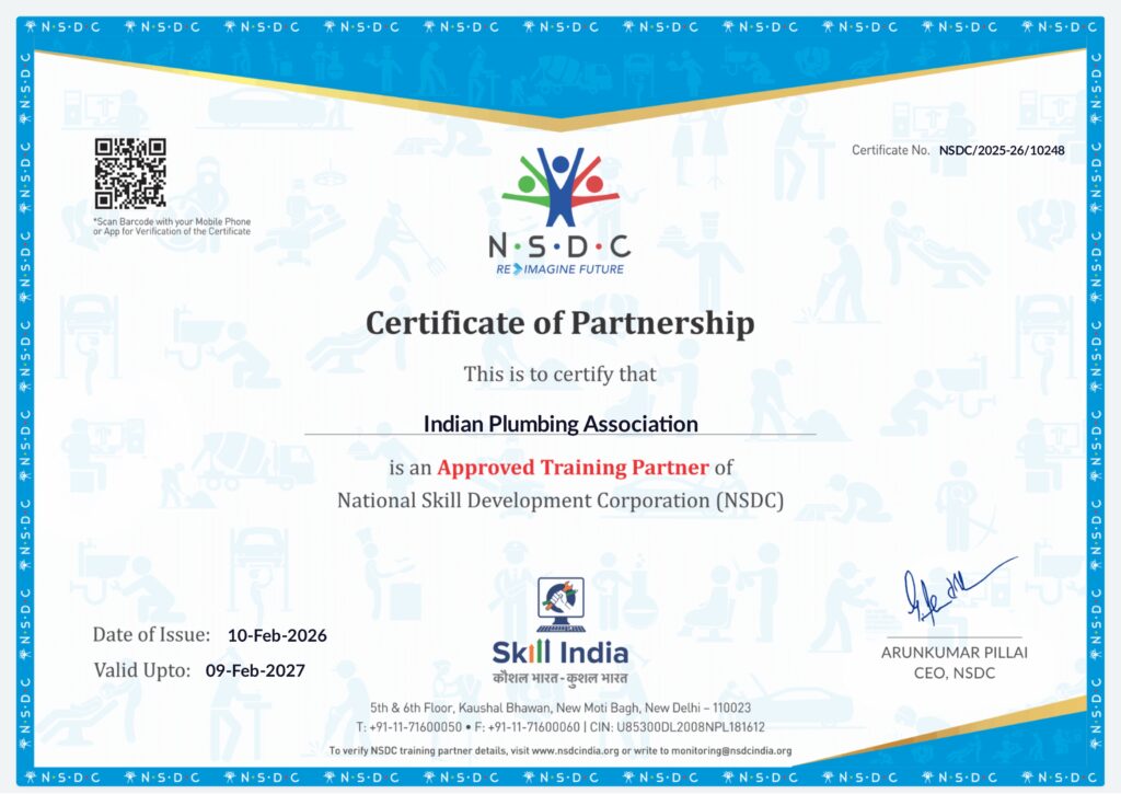 The Indian Plumbing Association (IPA) is an approved Training Partner of the National Skill Development Corporation (NSDC), offering co-branded certifications for its flagship programmes, including the Certified Water Auditor (CWA) under the Water Audit Council and the Indian Plumbing Professionals League (IPPL). This collaboration strengthens the credibility of IPA’s skill development initiatives and ensures nationally recognized certification aligned with industry standards.